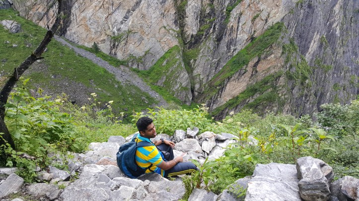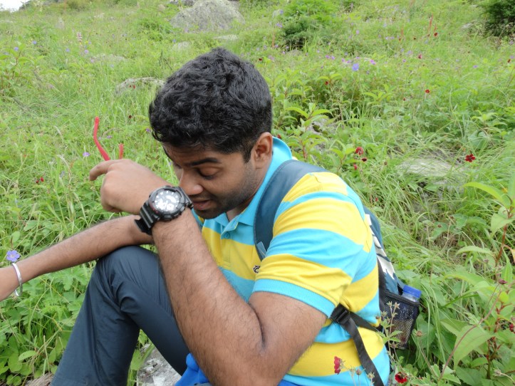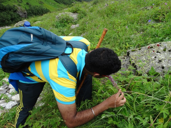 Debby stuck along with me but she could’ve done this much faster. Maybe she would’ve been able to see more of the valley if not for me. One thing I haven’t been talking about is how scenic the entire journey was. Both on Day 1 and so far today. I think that’s the only thing that kept me going (apart from my ego maybe). We did stop at a couple of spots to click some pictures. Once we got to the entrance, we could go around anywhere we wanted to. There were multiple paths leading to different places in the valley. The valley is home to some hundred or thousands of species of flora. It doesn’t necessarily look like the Tulip gardens. It was mostly lush and green with different kinds of flowers blooming all over the place. As we started walking into the valley, another trekker from Kerala complimented Debby for her stamina while he was sympathetic looking at my condition. (: